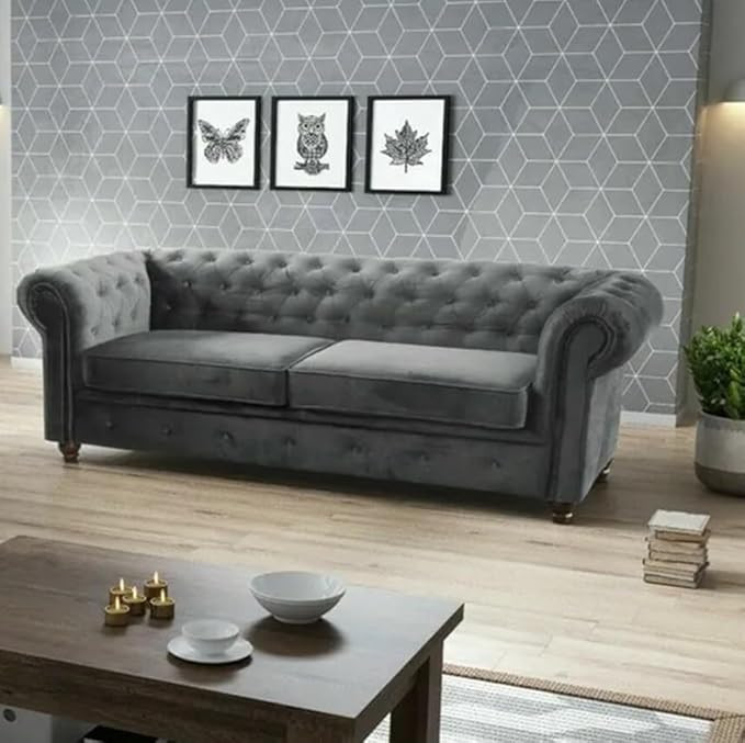 Die Chesterfield-Sofagarnitur ist wunderschön gestaltet und aus hochwertigem, strapazierfähigem Stoff gefertigt. Jedes Stück verfügt über einen stabilen Hartholzrahmen, der im Ofen getrocknet, verleimt und verstärkt wurde, um eine lange Lebensdauer zu gewährleisten. Die Sitze sind mit weichen Schaumstoffkissen für mehr Komfort gefüllt und die Sitzbezüge sind abnehmbar, um eine einfache Reinigung zu ermöglichen.