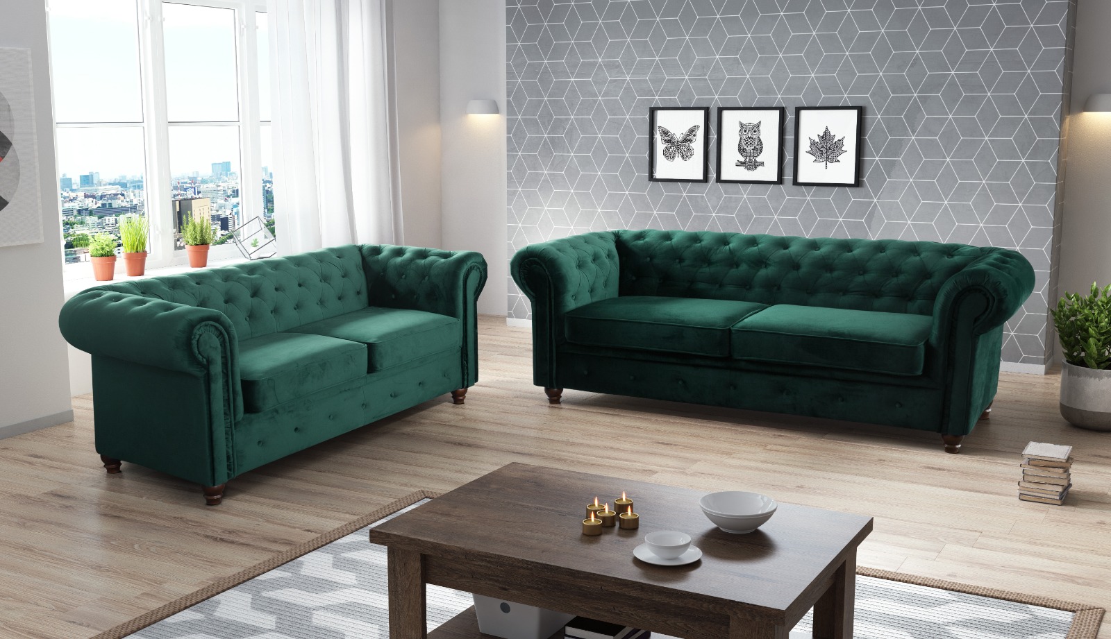 Gaba Chesterfield-Sofagarnitur 3 + 2 Plüsch Samt Flaschengrün